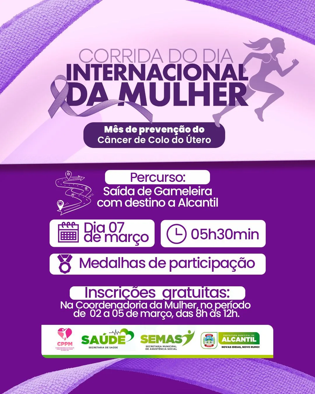 A abertura do Março Lilás em Alcantil começa às 5h30 com a Corrida do Dia Internacional da Mulher, saindo da comunidade de Gameleira com destino ao município.